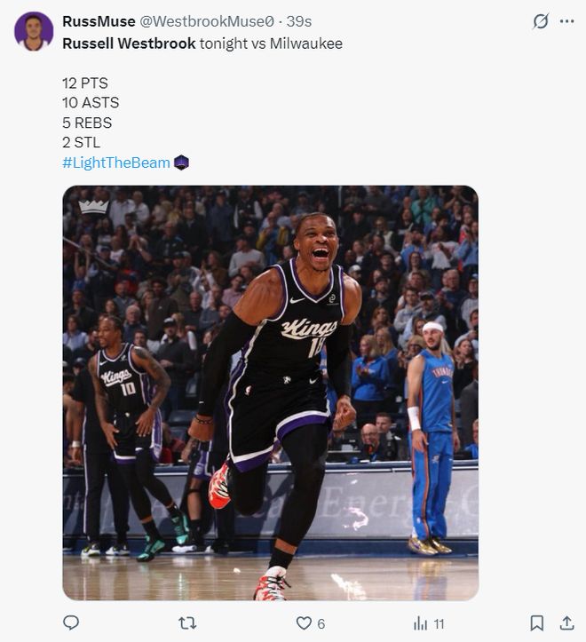 国王球迷们都对威少的表现送上赞誉:整个下半场威少都紧紧贴防迈尔斯-特纳,我只想让大家知道威少很努力;